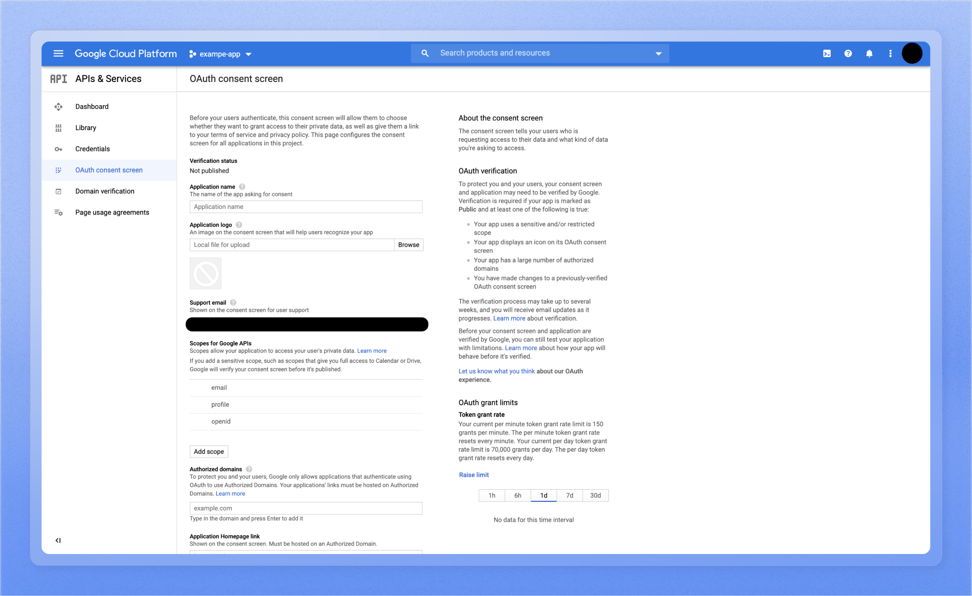 - Navigate to the OAuth consent screen under APIs & Services. Choose your configuration and target users, then click Create.