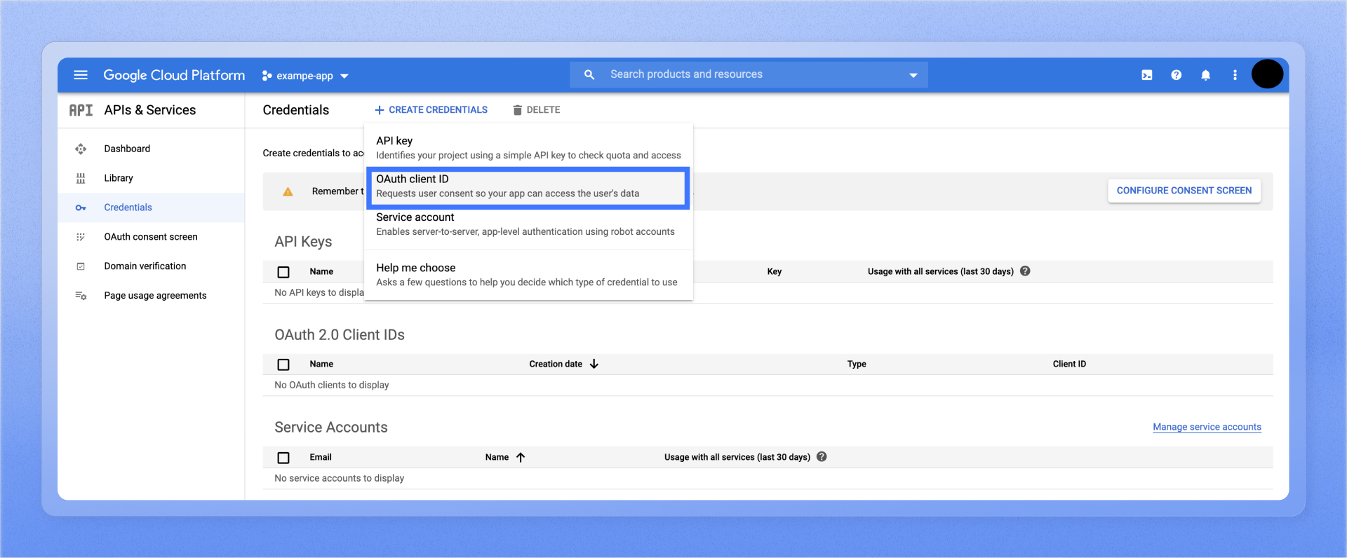 - Go to the Credentials screen, click Create Credentials, and select OAuth client ID.