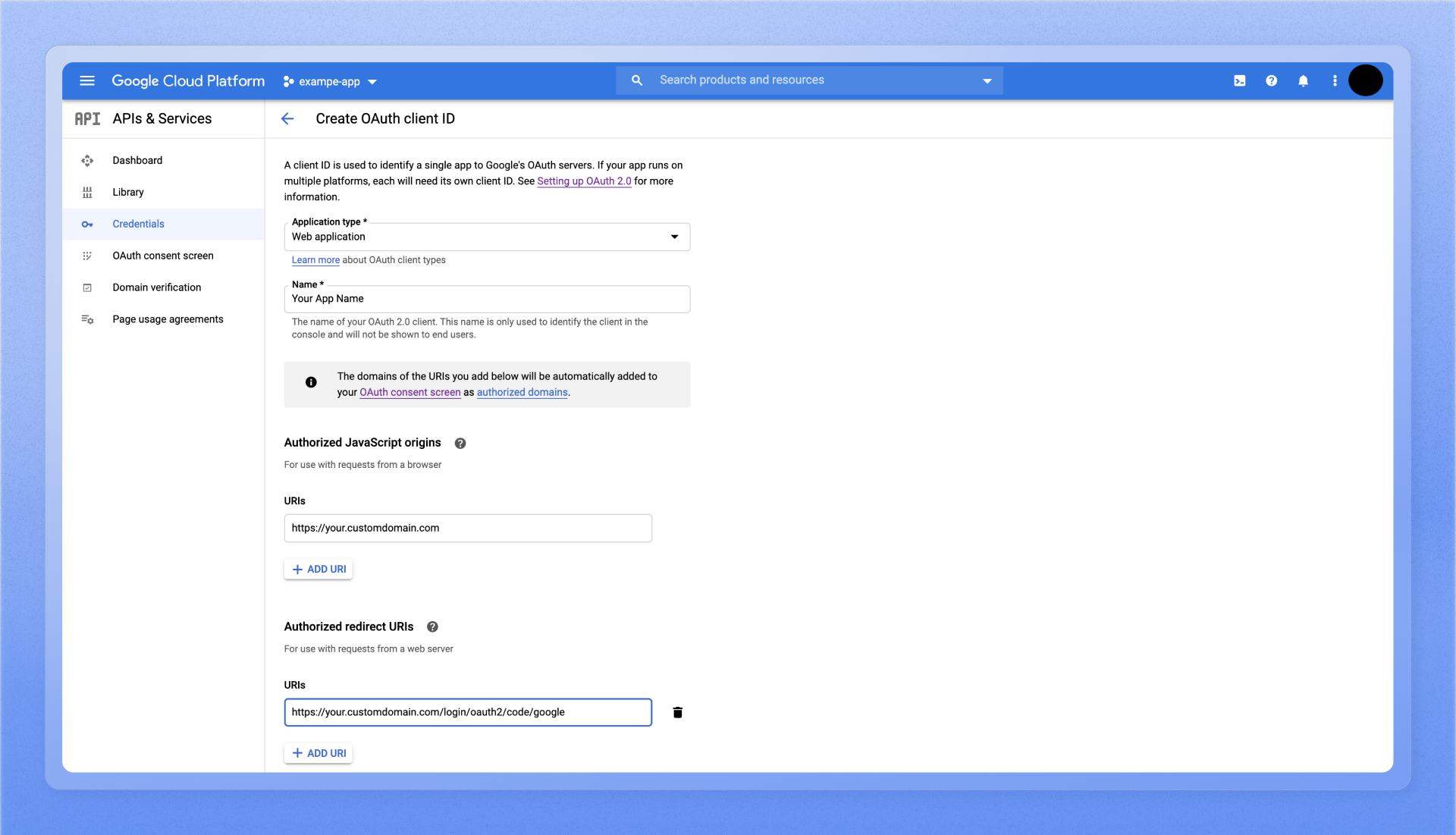 - Authorized JavaScript origins: The HTTP origins that host your web application, e.g.,