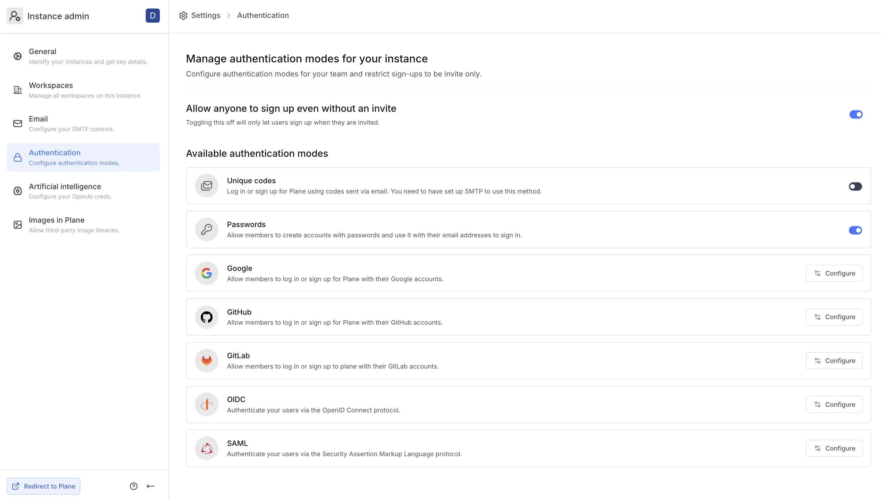 Control what SSO and OAuth services your users can use to sign up and log in to your Plane instance. You can also toggle unique code and password logins on and off from here. Learn more here.