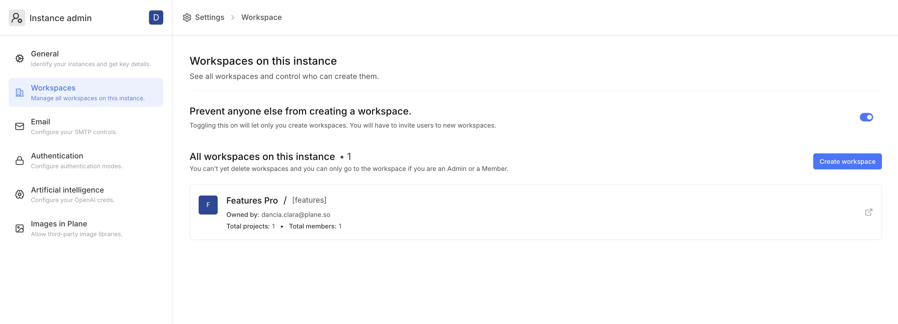 Toggle the Prevent anyone from creating a workspace option to prevent anyone else from creating workspaces. Once enabled, only you (the instance admin) can create new workspaces.